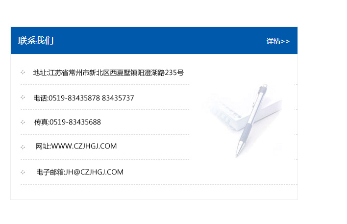 地址:常州市新北區友邦商務大廈1幢16、17層  電話:0519-85101652  傳真:0519-85112595  郵編:213022  網址:www_cz-jiayue_cn.b-honest.com  郵箱:xiajifengaa@163.com